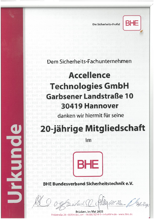Accellence ist seit über 10 Jahren als Hersteller von Produkten für Audio- und Video-Netzwerke und für Dienstleistungen im Bereich Entwicklung technischer Software und Systeme Mitglied des BHE. http://www.bhe.de/