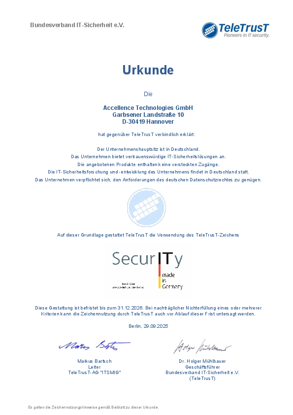 Accellence wurde mit dem Vertrauenssiegel 'IT Security made in Germany' des IT-Sicherheitsverbandes Deutschland (TeleTrusT) ausgezeichnet. TeleTrusT ist ein breit angelegtes Kompetenznetzwerk für IT-Sicherheit mit Mitgliedern aus Industrie, Verwaltung, Beratung und Forschung sowie nationalen und internationalen Partnerorganisationen mit ähnlicher Zielsetzung.